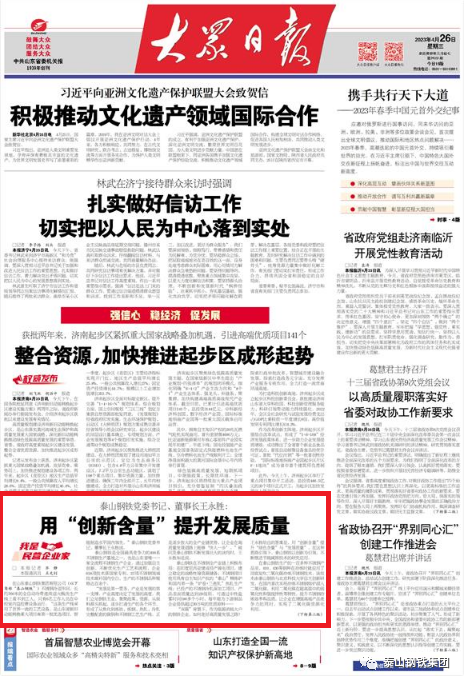 4月26日,《大众日报》在头版刊发新闻报道“泰山钢铁集团党委书记、董事长王永胜:用‘创新含量’提升发展质量”,介绍了王董事长带领集团探索高质量发展之路的“华体(中国)方案”。