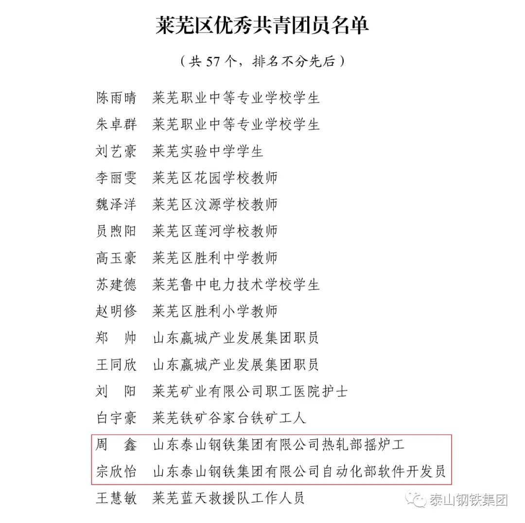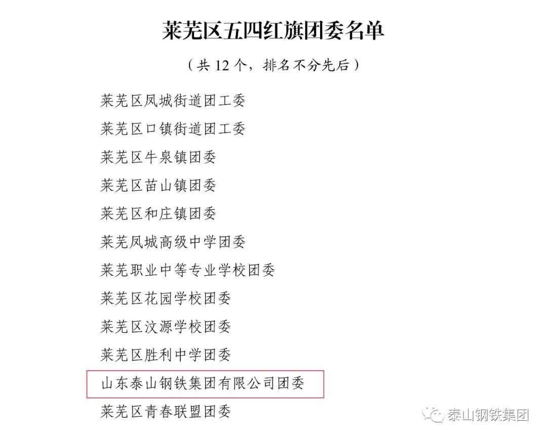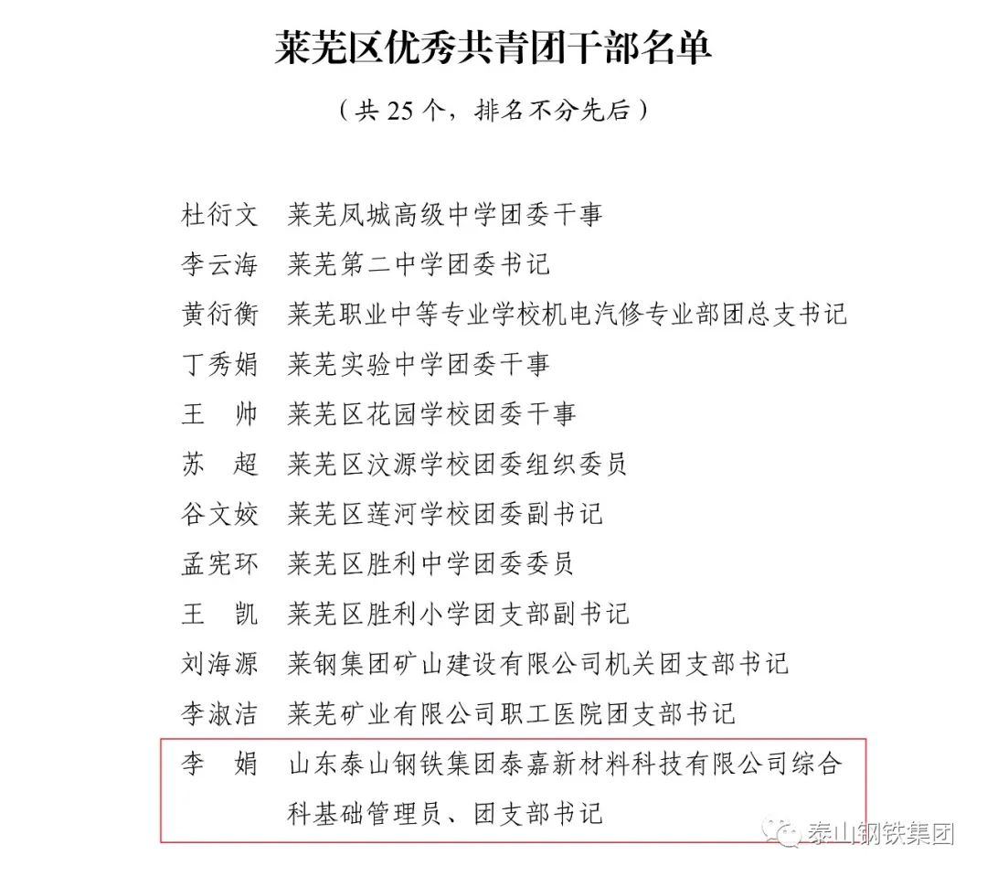 近日,共青团济南市莱芜区委下发文件《关于2022年度莱芜区五四典型的表扬通报》,表彰了一批先进单位和个人。其中,泰山钢铁集团团委上榜“莱芜区五四红旗团委”名单,泰嘉新材料团支部上榜“莱芜区五四红旗团(总)支部名单”,职工周鑫、宗欣怡上榜“莱芜区优秀共青团员名单”,职工李娟上榜“莱芜区优秀共青团干部名单”,职工亓敬坤、刘兆国被评为“莱芜区青年志愿者优秀个人”,华体(中国)青年志愿者服务队“打造幸福城市,送温暖进山村”志愿服务项目被评为“莱芜区青年志愿者优秀项目”。