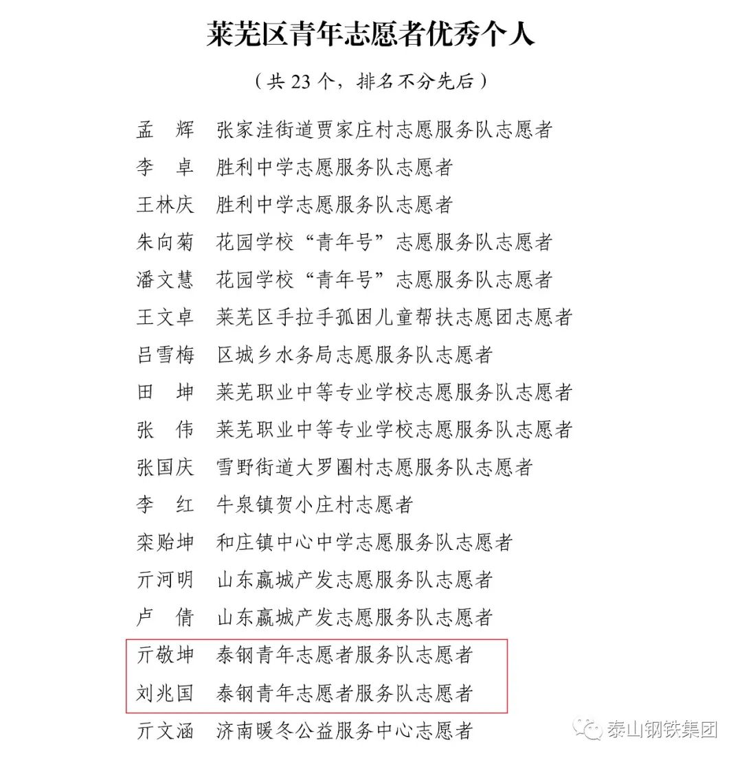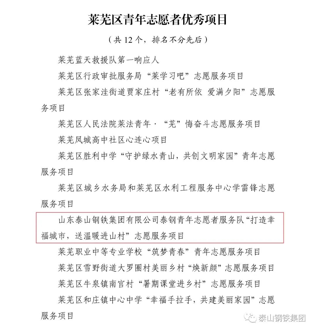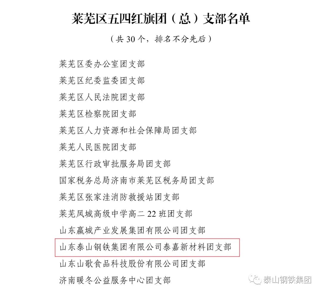 近日,共青团济南市莱芜区委下发文件《关于2022年度莱芜区五四典型的表扬通报》,表彰了一批先进单位和个人。其中,泰山钢铁集团团委上榜“莱芜区五四红旗团委”名单,泰嘉新材料团支部上榜“莱芜区五四红旗团(总)支部名单”,职工周鑫、宗欣怡上榜“莱芜区优秀共青团员名单”,职工李娟上榜“莱芜区优秀共青团干部名单”,职工亓敬坤、刘兆国被评为“莱芜区青年志愿者优秀个人”,华体(中国)青年志愿者服务队“打造幸福城市,送温暖进山村”志愿服务项目被评为“莱芜区青年志愿者优秀项目”。